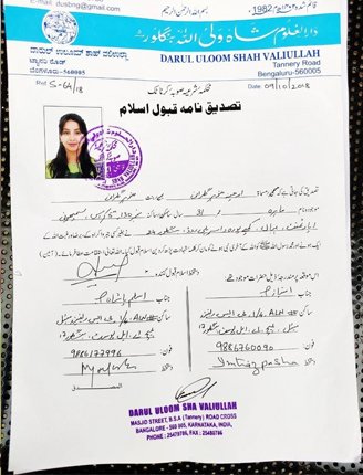 تصدیق نامہ کے مطابق ارچنا منوہر گلرانی بنت منوہرگلرانی عمر 31 سالہ نے بغیرکسی جبر کے با رضا و رغبت اللّٰہ کے ایک ہونے اور محمدﷺ کو آخری پیغمبر مان کر کلمہ شہادت پڑھ کر دین اسلام قبول کیا ہے۔