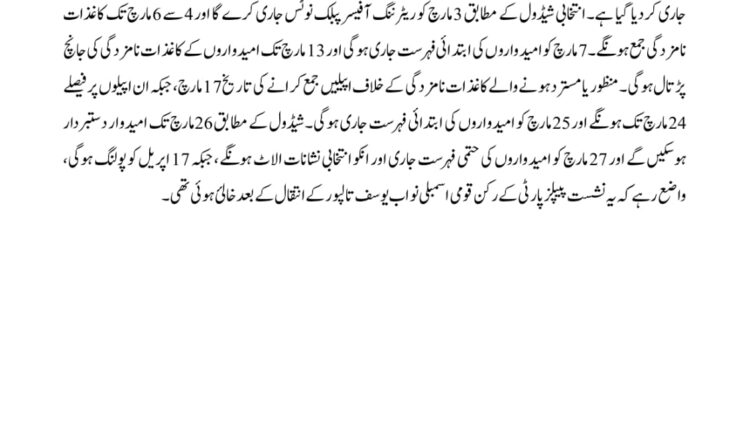 انتخابی شیڈول کے مطابق 3 مارچ کو ریٹرننگ آفیسر پبلک نوٹس جاری کرے گا اور 4 سے 6 مارچ تک کاغذات نامزدگی جمع ہونگے۔ 7 مارچ کو امیدواروں کی ابتدائی فہرست جاری ہوگی اور 13 مارچ تک امیدواروں کے کاغذات نامزدگی کی جانچ پڑتال ہوگی۔ منظور یا مسترد ہونے والے کاغذات نامزدگی کے خلاف اپیلیں جمع کرانے کی تاریخ 17 مارچ، جبکہ ان اپیلوں پر فیصلے 24 مارچ تک ہونگے اور 25 مارچ کو امیدواروں کی ابتدائی فہرست جاری ہوگی۔ شیڈول کے مطابق 26 مارچ تک امیدوار دستبردار ہوسکیں گے اور 27 مارچ کو امیدواروں کی حتمی فہرست جاری اور انکو انتخابی نشانات الاٹ ہونگے، جبکہ 17 اپریل کو پولنگ ہوگی، واضع رہے کہ یہ نشست پیپلز پارٹی کے رکن قومی اسمبلی نواب یوسف تالپور کے انتقال کے بعد خالئ ہوئی تھی۔