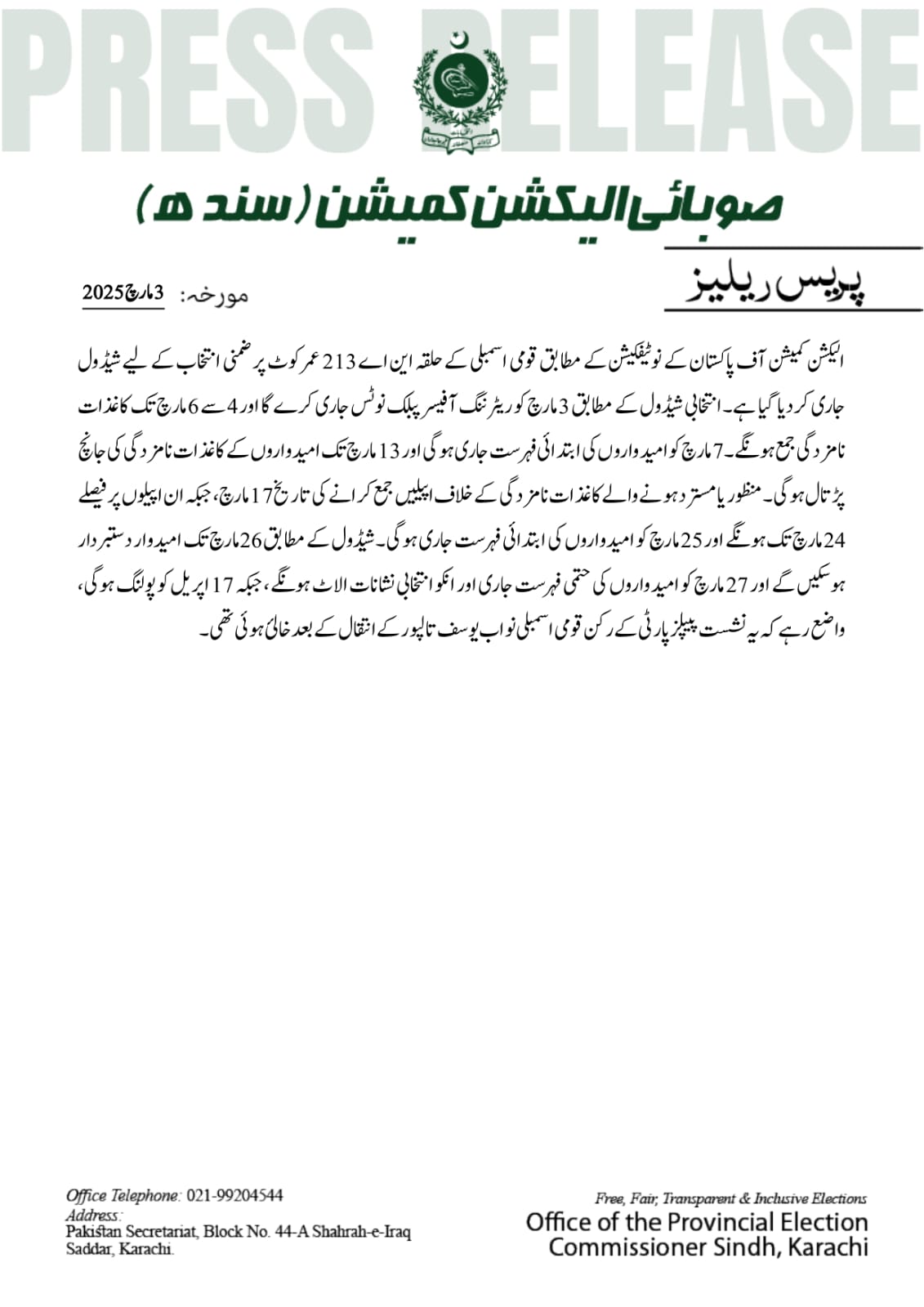 حلقہ این اے 213 عمر کوٹ پر ضمنی انتخاب کے لیے شیڈول جاری کردیا گیا