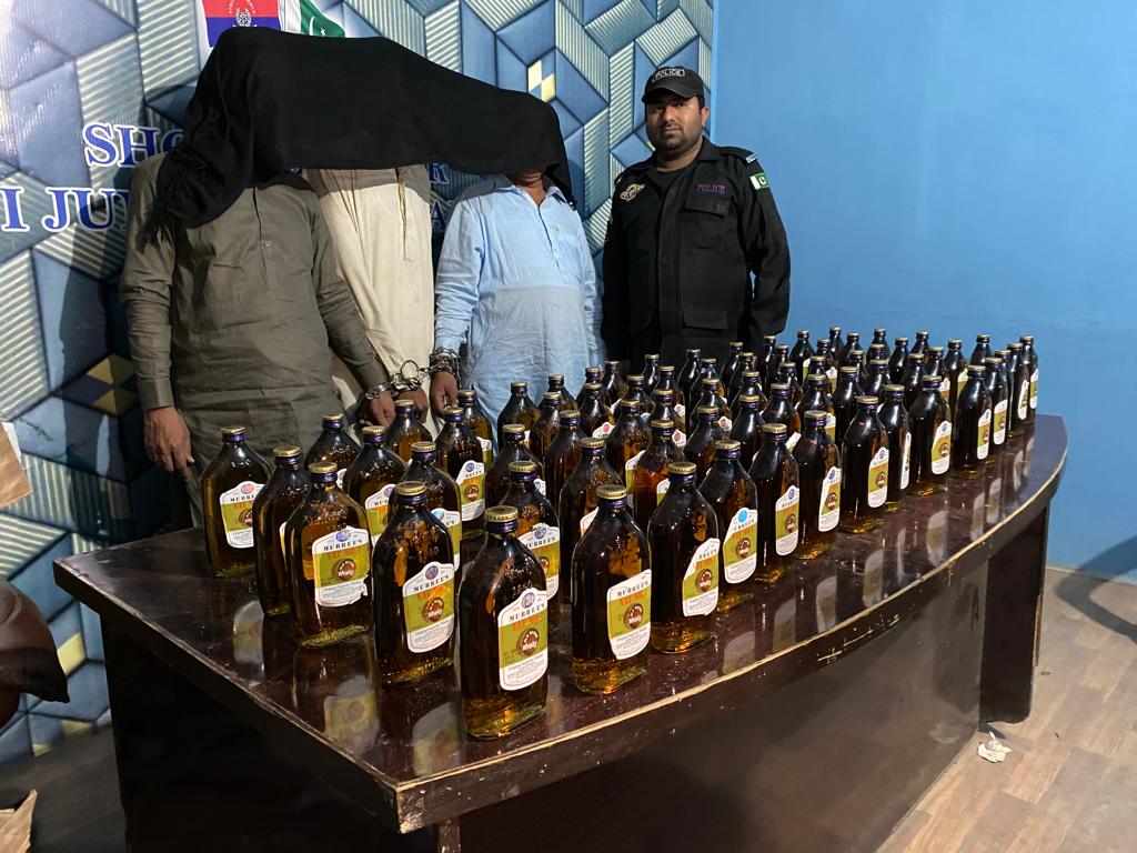 گرفتار ملزمان کے قبضے سے 3 عدد کارٹن میں وسکی شراب کی بوتلیں برآمد ہوئی جن کی مالیت لاکھوں روپوں میں ہے