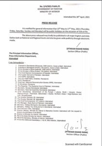 سوشل میڈیا پر 26 اپریل کی تاریخ سے ایک جعلی نوٹیفکیشن تیزی سےگردش کر رہاتھا جس میں عید کے موقع پر 5 روز کی تعطیل کا اعلان کیا گیاتھا