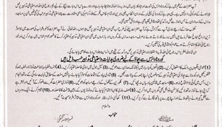 اسی سلسلے کے اندر وفاق المدارس نے گائیڈ لائن مرتب کرکے حکومت انتظامیہ کے ساتھ تعاون کرنے درخواست کرتے ہوئے منبر ومحراب سے سے موثر عوامی رہنمائی کا سلسلہ جاری کرنے کی ہدایات بھی دی ہیں۔ان حالات میں دینی رہنماؤں کی طرف سے اس اقدام کی بہت اہمیت ھے