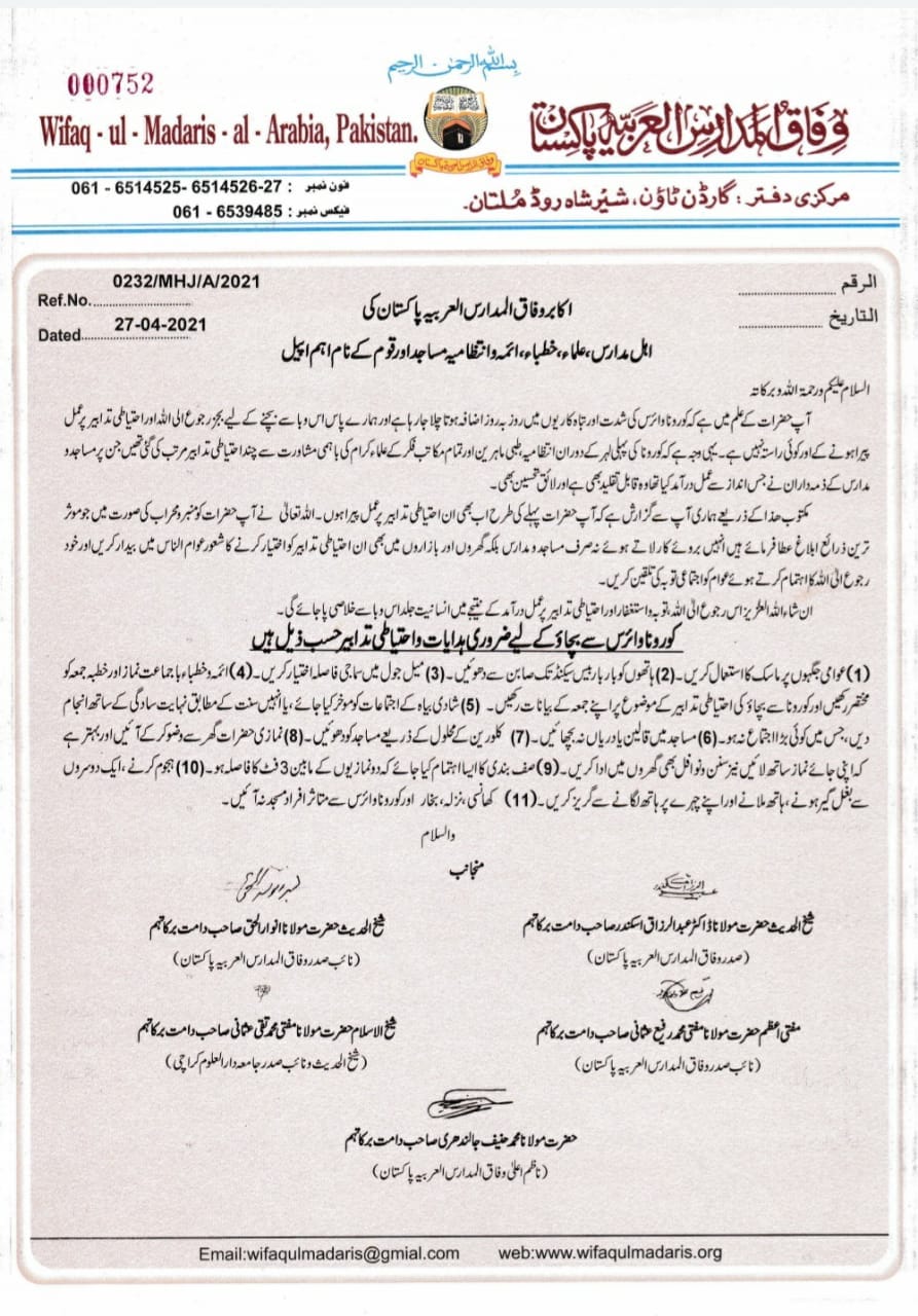 وفاق المدارس نے پورے ملک کے علماء طلبہ ائمہ مساجد خطباء سے کرونا کی دوسری لہر میں شدت سے احتیاط اور ایس او پیز پر عمل کرنے کی اپیل کی ہے۔