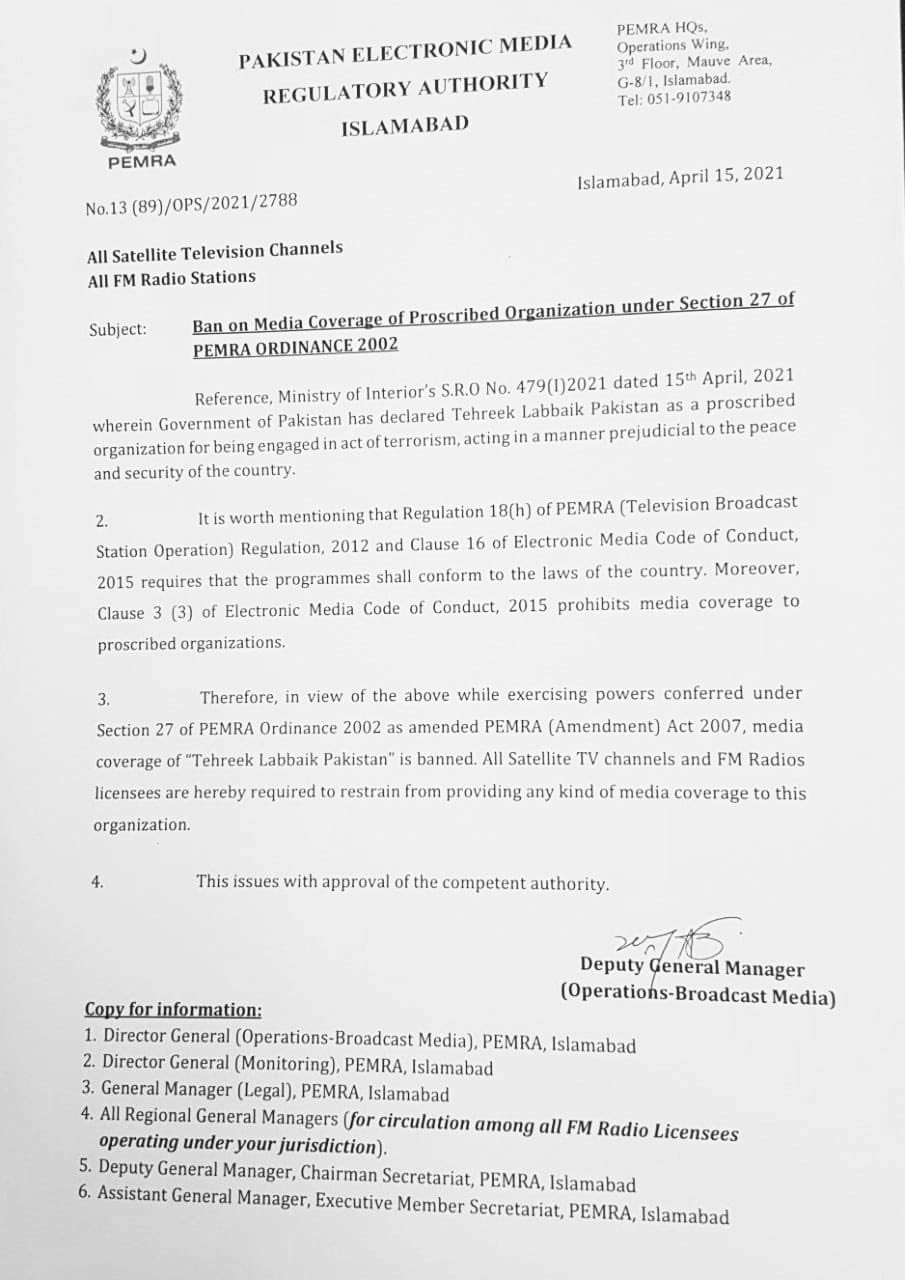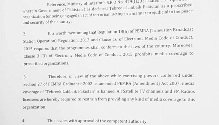 کالعدم تحریک لبیک پاکستان کی ہرقسم کی میڈیاکوریج پرپابندی لگادی پیمرااعلامیہ: