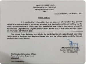 Federal Secretariat will be closed on Thursday owing to Pakistan Day Parade. Notification issued